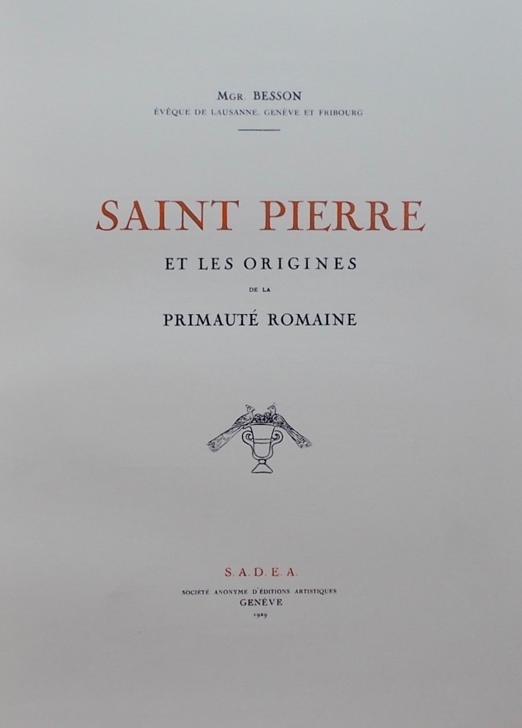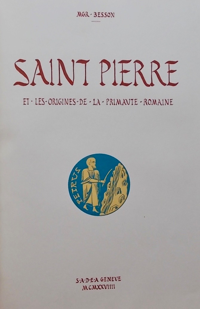 BESSON (Marius, Mgr) Saint Pierre et les origines de la primauté romaine. Genève, S. A. D. E. A., 1929.