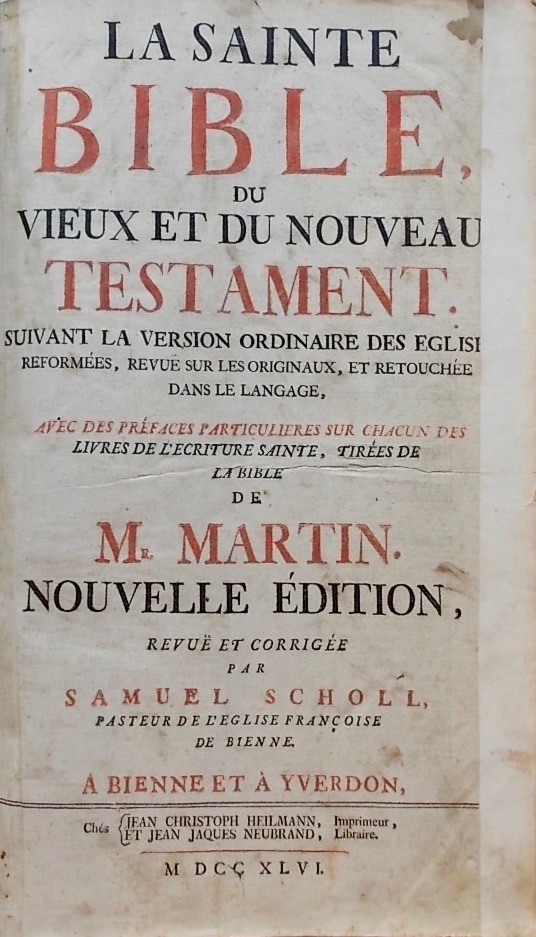 ![[Bible] - MARTIN (Mr) - SCHOLL (Samuel) La Sainte Bible, du Vieux et du Nouveau Testament. Suivant la version ordinaire des Eglises réformées, revue sur les originaux, et retouchée dans le langage. Avec des préfaces particulières sur chacun des Livres de l'Ecriture sainte, tirées de la Bible de Mr. Martin. Nouvelle édition, revue et corrigée par Samuel Scholl, pasteur de l'Eglise françoise de Bienne. A Bienne et à Yverdon, Jean Christoph Heilmann et Jean Jacques Neubrand, 1746.](https://cabinetamateur.ch/wp-content/uploads/2025/10/37462_1.jpg)
