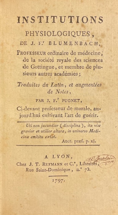 BLUMENBACH (Jean-Frédéric) Institutions physiologiques. Lyon, J. T. Reymann et Cie, 1797.