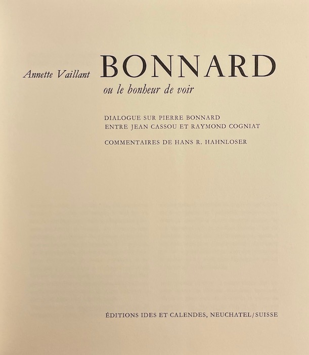 [BONNARD] – VAILLANT (Annette) Bonnard, ou le bonheur de voir. Neuchâtel, Ides et Calendes (coll. Grande Monographie), 1965.
