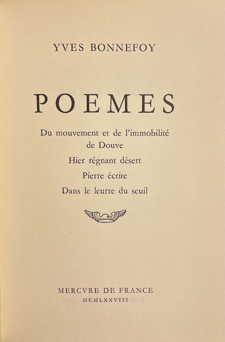 BONNEFOY (Yves) Poèmes. Du mouvement et de l’immobilité de Douve – Hier régnant désert – Pierre écrite – Dans le leurre du seuil. Paris, Mercure de France, 1978.