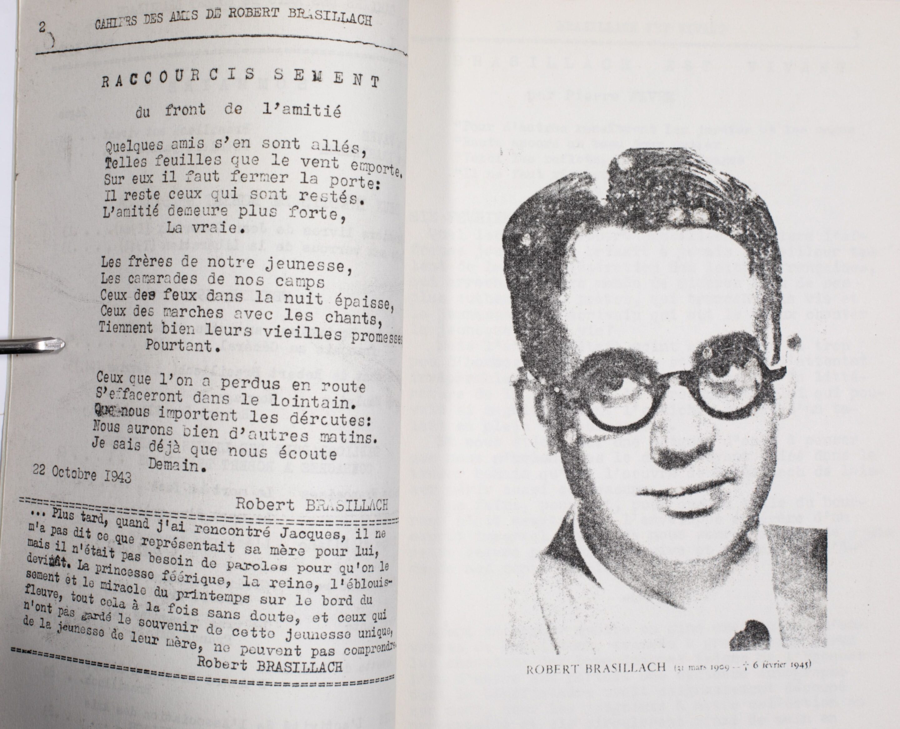 No 6 : Bibliographie des articles de Robert Brasillach / Le théâtre de Claudel / Journal d’un homme occupé, 123p.