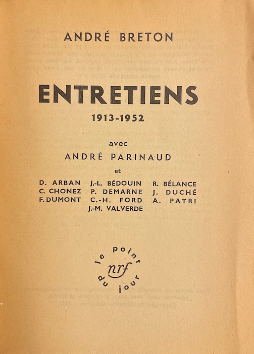 BRETON (André) Entretiens (1913-1952). Paris, Gallimard (coll. Le Point du Jour), 1952.