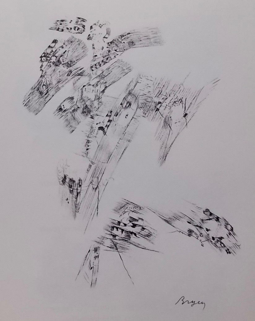 Edition originale tirée à 445 exemplaires, tous signés par l’artiste à la justification. Rassemble cinq poèmes de C. B. illustrés de 6 dessins en noir. Un des 45 exemplaires de tête accompagnés d’une gravure originale justifiée et signée par Camille Bryen. On joint le catalogue de l’exposition de Bryen à la galerie Cour St. Pierre à Genève en 1975, avec un texte de présentation d’André Kuenzi. En parfaite condition