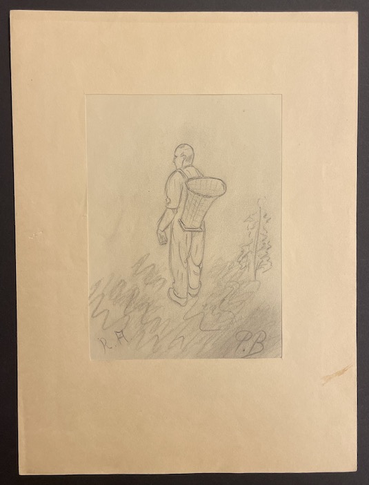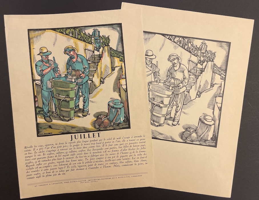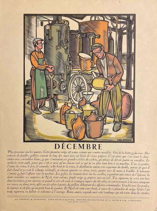 Edition originale. Suite de 12 bois en couleurs de Paul Boesch, légendés par Paul Budry décrivant mois après mois le travail du vigneron dans sa vigne et dans sa cave. Un des 50 exemplaires nominatifs accompagnés d’une suite en noire et d’un dessin original. Magnifique exemplaire.