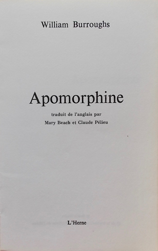 BURROUGHS (William) Apomorphine. Paris, L’Herne (coll. Les Livres noirs), 1969.