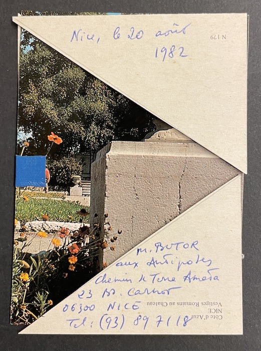 Edition originale. Un des 1000 exemplaires numérotés sur vélin bouffant (seul tirage après 26 exemplaires de tête sur Ingres). Exemplaire enrichi d’un envoi autographe signé de l’auteur en page de faux-titre et accompagné d’une carte postale-collage de Butor adressée à la même personne.