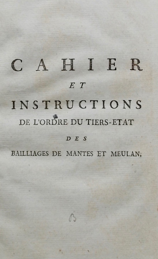 *** Cahier et instructions de l’ordre du Tiers-Etat des bailliages de Mantes et Meulan, remis le 26 mars 1789, à MM. Meunier du Breuil, Lieutenant-Général du Bailliage & Siège présidial de Mantes, & Germiot, Cultivateur, Députés. Sans lieu, sans nom, sans date.