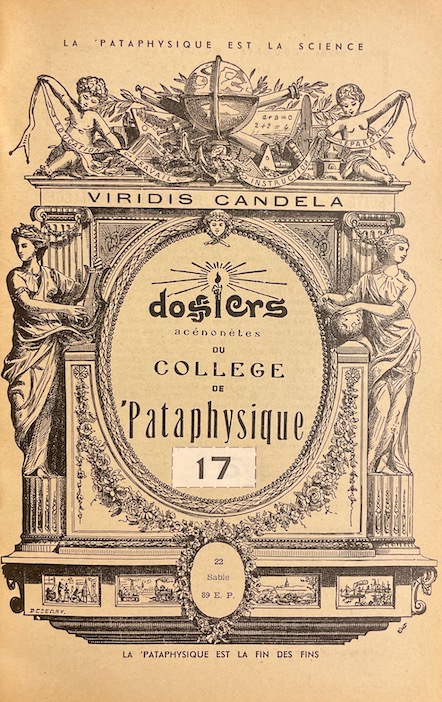 | Lieu d'éd. - Editions - Achevé d'imprime | Viridis Candela / Cahiers du Collège de Pataphysique, Dossier n° 17 du 22 Sable LXXXIX (22 décembre 1961). |
