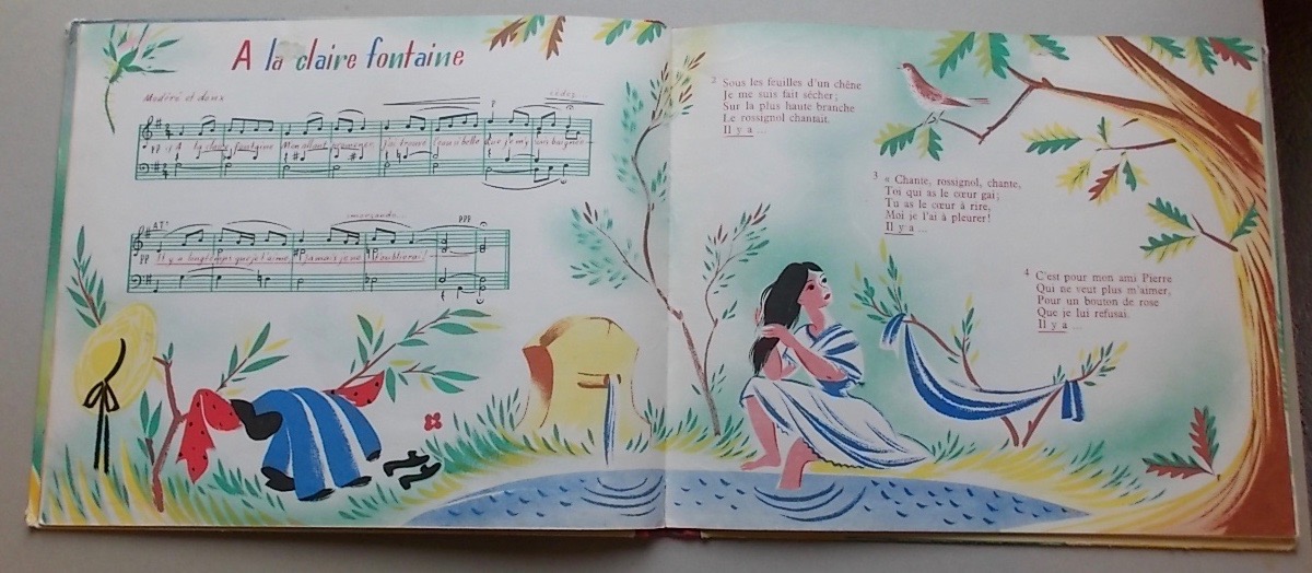 Première édition de ce recueil de 21 chansons enfantines harmonisées par J. Canteloube et illustrées de charmantes compositions en couleurs par Elisabeth Ivanowsky. Coins légèrement émoussés.
