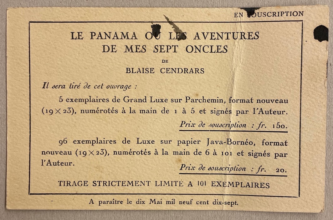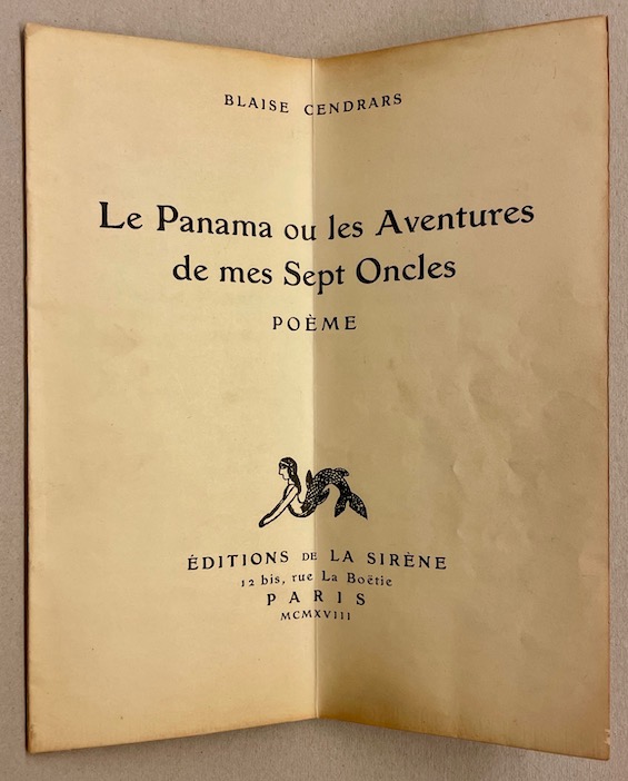 CENDRARS (Blaise) Le Panama ou les aventures de mes sept oncles. Paris, La Sirène, 1918.