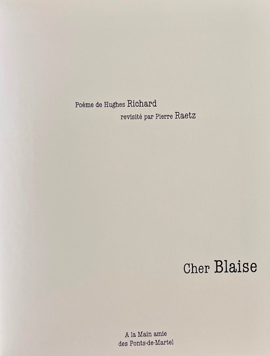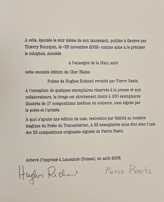 [CENDRARS] – RICHARD (Hughes) & RAETZ (Pierre) Cher Blaise. Les Ponts-de-Martel, A La Main Amie, 2008.