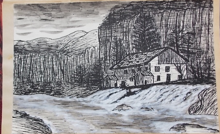 Edition originale fort peu courante. Exemplaire enrichi d’un dessin anonyme à l’encre de Chine rehaussé de gouache représentant le fameux moulin sur le Doubs.