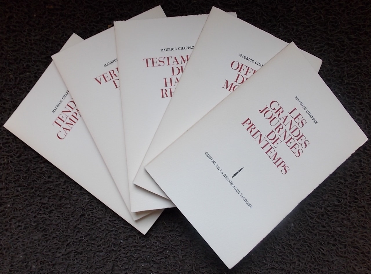 CHAPPAZ (Maurice) Verdures de la nuit – Les grandes journées de printemps – Testament du Haut-Rhône – Office des morts – Tendres campagnes. Lausanne, Cahiers de la Renaissance Vaudoise, 1967.