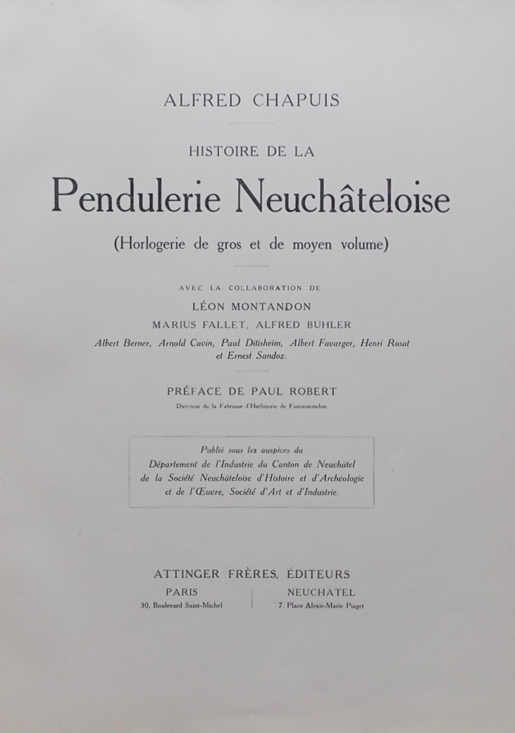 CHAPUIS (Alfred) Histoire de la pendulerie neuchâteloise (Horlogerie de grand et de moyen volume). Paris et Neuchâtel, Attinger Frères, (1917).