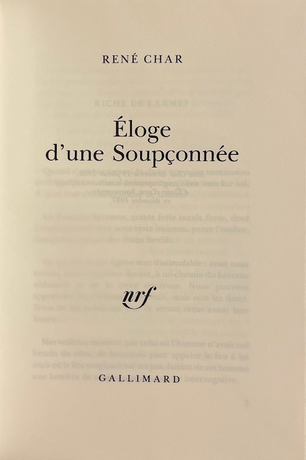 CHAR (René) Eloge d’une soupçonnée. Paris, Gallimard (coll. Blanche), 1988.