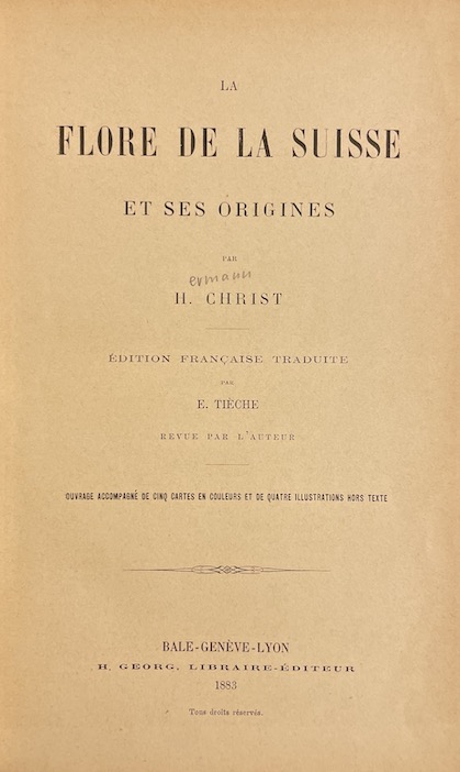 CHRIST (Hermann) La flore de la Suisse et ses origines. Bâle – Genève – Lyon, Georg & Cie, 1883.