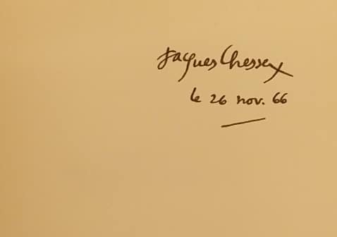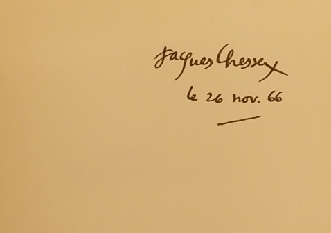 Réédition légèrement corrigée. Celui-ci est un des 17 exemplaires de tête sur vergé à la cuve (c’est l’exemplaire n° I) avant les 1200 exemplaires de l’édition courante. Préface de Jacques Chessex. Exemplaire enrichi de la signature de Chessex en page de garde, datée du 26 novembre 66. Dos légèrement passé.