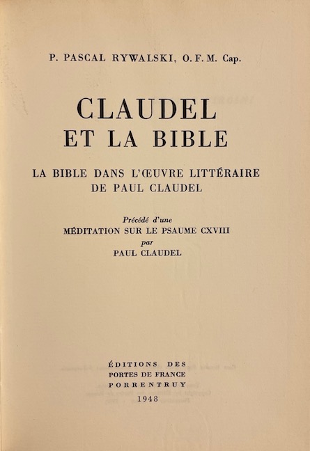 [CLAUDEL] – RYWALSKI (P. Pascal) Claudel et la bible. La bible dans l’oeuvre littéraire de Paul Claudel. Porrentruy, Aux Portes de France, 1948.