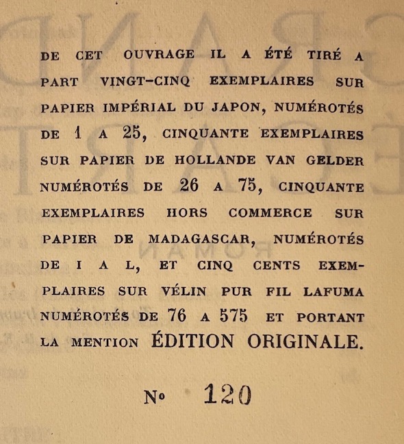 Edition originale numérotée 1/500 exemplaires sur vélin pur fil Lafuma (exemplaire n°120). A l’état de neuf, non coupé.