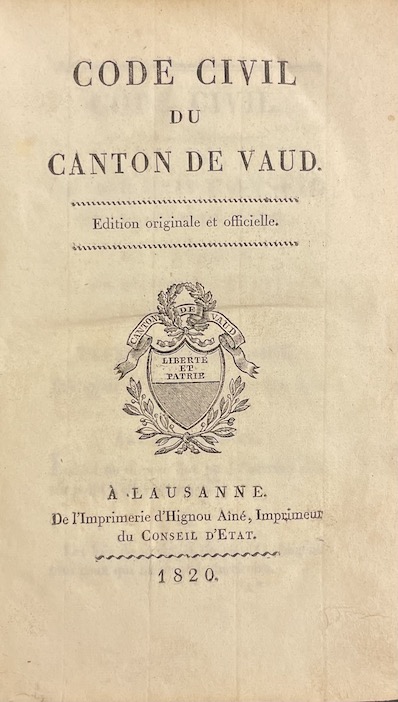 *** Code civil du canton de Vaud. Edition originale et officielle. A Lausanne, de l’Imprimerie d’Hignou Ainé, Imprimeur du Conseil d’Etat, 1820.