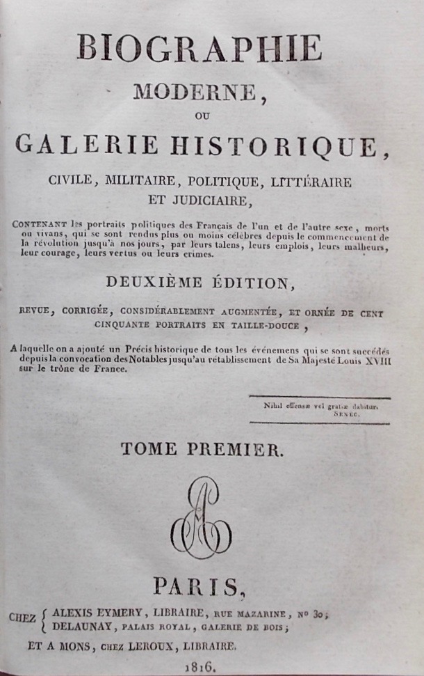 COLLECTIF Biographie moderne, ou galerie historique, civile, militaire, politique, littéraire et judiciaire. Paris, Eymery et Delaunay, 1816.