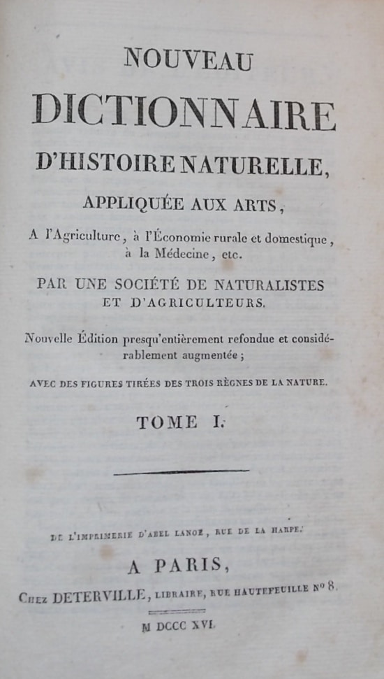COLLECTIF Nouveau dictionnaire d’histoire naturelle, appliquée aux arts, à l’agriculture, à l’économie rurale et domestique. à la médecine, etc… par une société de naturalistes et d’agriculteurs. Paris, Deterville, 1816-1819.