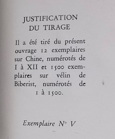 Un des 12 exemplaires de tête numérotés en romains sur Chine (celui-ci ex. n° V). Avant-propos de l’éditeur (Fred Uhler). Cette édition ne donne que la première partie du texte de l’auteur. En excellente condition. Des plus rares sur ce papier, bien évidemment.