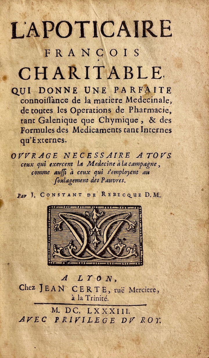 CONSTANT DE REBECQUE (Jacob de) L’apoticaire françois charitable. Lyon, Jean Certe, 1683.