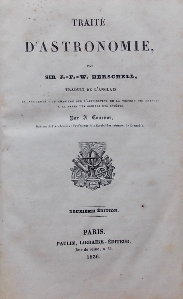 [COURNOT (A.)] – HERSCHELL (J.-F.-W.) Traité d’astronomie, traduit de l’anglais et augmenté d’un chapitre sur l’application de la théorie des chances à la série des orbites des comètes. Paris, Paulin, 1836.
