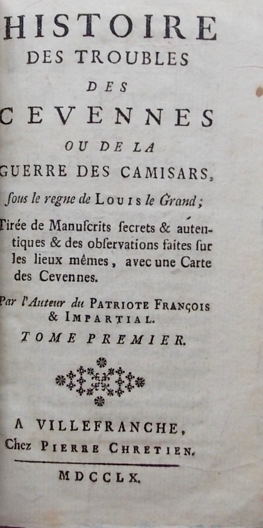 ![COURT (Antoine) Histoire des troubles des Cévennes ou de la guerre des Camisars, sous le règne de Louis le Grand ; tirée de Manuscrits secrets & authentiques & des observations faites sur les lieux mêmes, avec une carte des Cevennes. A Villefranche [Genève], chez Pierre Chretien, 1760.](https://cabinetamateur.ch/wp-content/uploads/2025/12/38983_1.jpg)