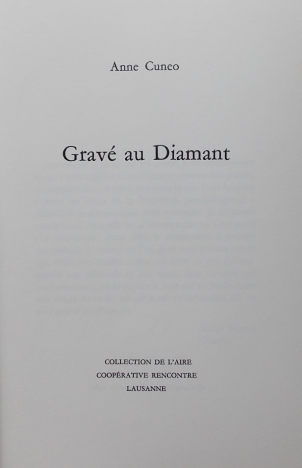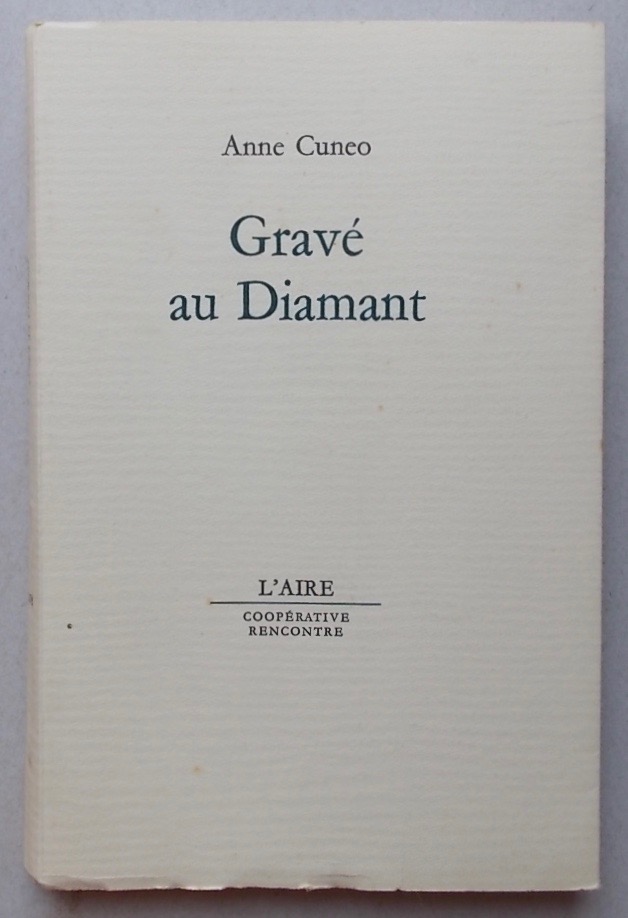 CUNEO (Anne) Gravé au Diamant. Lausanne, Coopérative Rencontre – Collection de L’Aire, 1967.