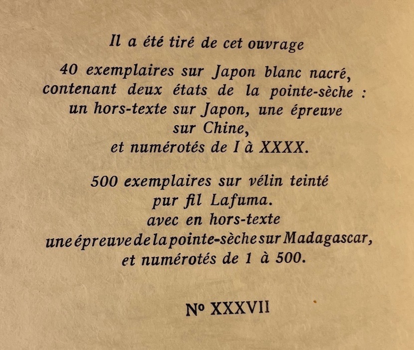 Edition originale. Un des 40 exemplaires de tête numéroté sur Japon. Celui-ci (N° XXXVII), contenant 2 états de la pointe sèche d’Yvonne Préveraud (1 hors-texte sur Japon blanc nacré, et 1 épreuve sur chine numérotée 14/50 et signée par l’artiste). Préface d’André Billy. A l’état de neuf, non coupé.