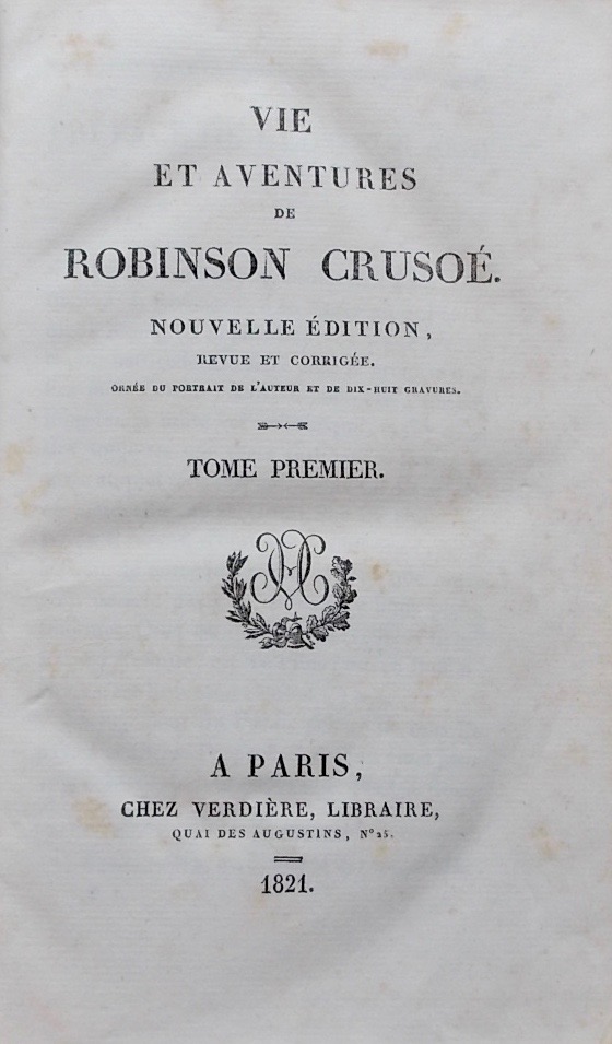 DE FOE (Daniel) Vie et aventures de Robinson Crusoé. Paris, Verdière, 1821.