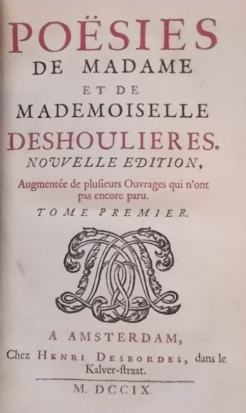 DESHOULIERES (Antoinette du Ligier de la Garde & Antoinette Thérèse) Poésies de Madame et de Mademoiselle Deshoulières. Nouvelle édition augmentée de plusieurs ouvrages. A Amsterdam, chez Henri Desbordes, 1709.