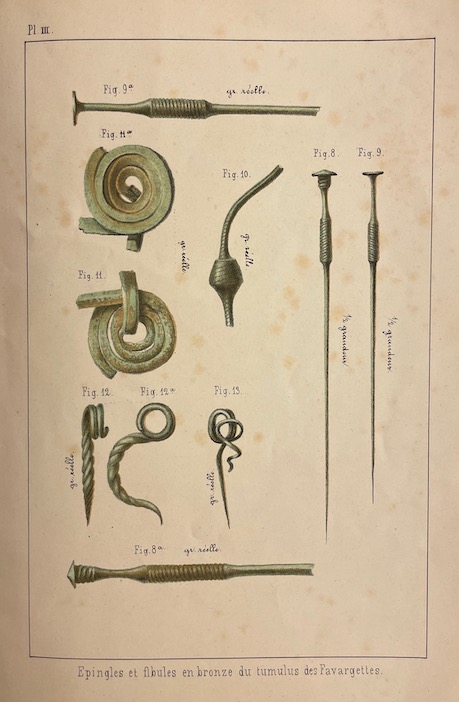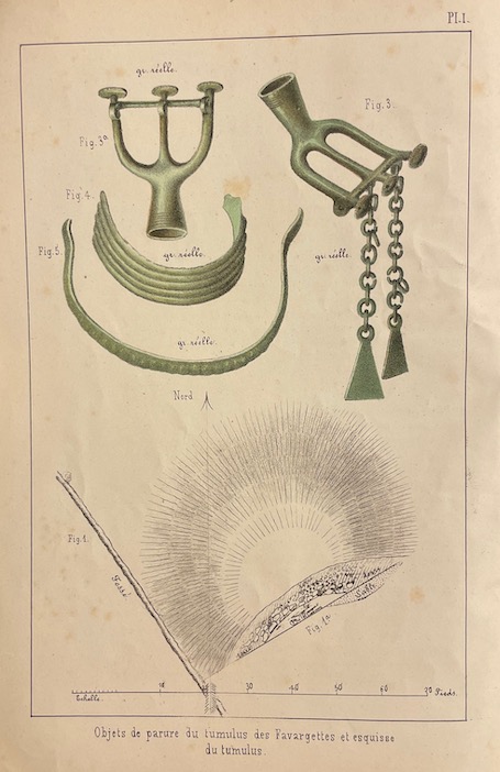 DESOR (E.) Le tumulus des Favargettes. Précédé d’un Coup d’oeil sur les travaux de la Société d’Histoire. Neuchâtel imprimerie de H. Wolfrath et Metzner, 1868.