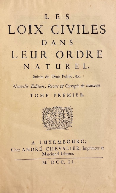 [DOMAT (Jean)] Les loix civiles dans leur ordre naturel: suivies du droit public, &c, A Luxembourg, chez André Chevalier, 1702.