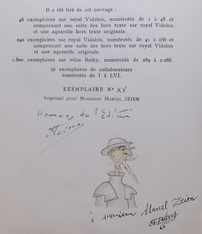 Edition numérotée limitée à 2144 exemplaires. Celui-ci un des 56 exemplaires de collaborateur nominatif et numéroté en chiffres romain sur vélin Bulky. Illustré de splendides et innombrables compositions en couleurs de Dubout. Enrichi d’un envoi autographe et d’un petit dessin original de Dubout en page de justification. En parfaite condition.