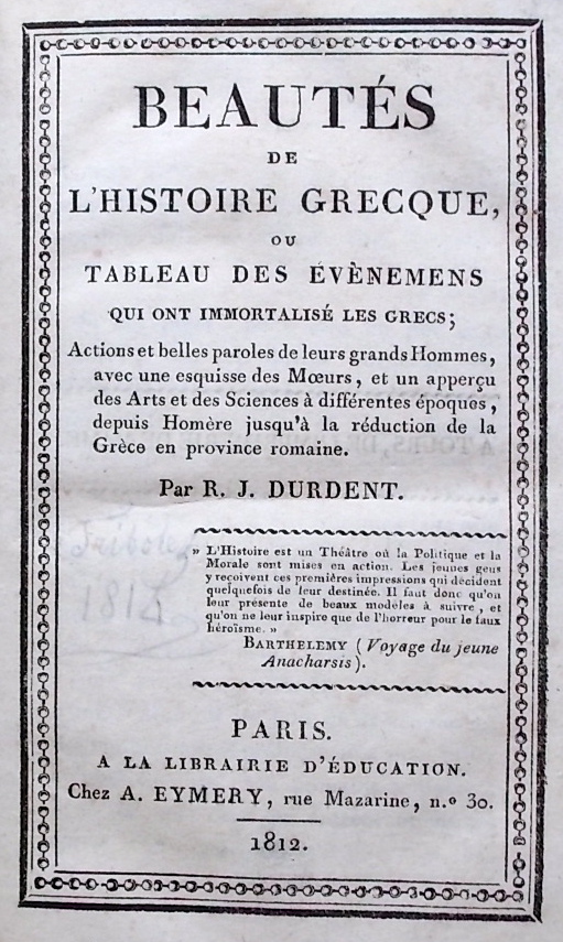 DURDENT (R. J.) Beautés de l’histoire grecque, ou tableau des événemens qui ont immortalisé les grecs. Paris, Alexis Emery, 1812.