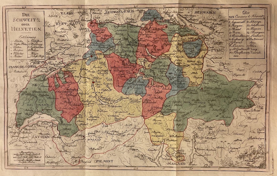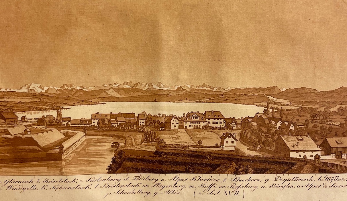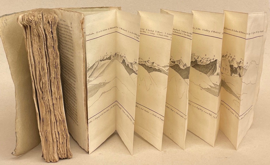 Première édition française en 4 volumes. Publié en 1795 pour la première fois en deux petits volumes sous le titre: Instructions pour un voyageur. Ancêtre des Guides Joanne et des Guides Bleus. Illustré avec 8 planches et une carte de la Suisse hors texte: trois gravures en aquatinte, gravées par F. Hégi, deux cartes dépliantes dont une en couleur, trois longs panoramas dépliants et une gravure montrant un crampon pour parcourir les glaciers. Premier guide touristique traitant de l’ensemble de la Suisse et des territoires voisins, il comprend, outre des notices détaillées sur chaque localité, des renseignements généraux sur la Suisse et une importante bibliographie des estampes et ouvrages parus jusqu’en 1809. Ce guide est un grand classique devenu rare. Les 2° et 3° éditions sont les plus recherchées, à la fois très détaillées et bien illustrées. . [Barth 17807; Perret 1474; Lonchamp 889; Wäber S. 46 (2è éd. de 1810-11); Hirsch-Hübotter II, 369; Griep-Luper 0375; Appenzeller, Werkverz. Hegi N° 207-209; Perret – Regards sur les Alpes, page 115. Notice 33. (éd. de 1810-1811, ne mentionne pas cette édition de 1805)].