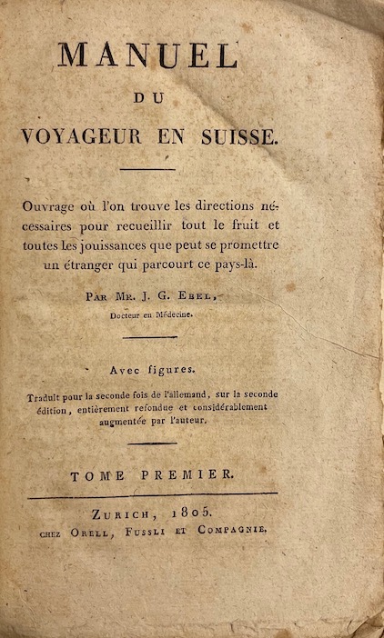 EBEL (Johann Gottfried) Manuel du voyageur en Suisse. Ouvrage oû l’on trouve les directions nécessaires pour recueillir tout le fruit et toutes les jouissances que peut se permettre un étranger qui parcourt ce pays-là. Traduit pour la seconde fois de l’allemand, sur la seconde édition, entièrement refondue et considérablement augmentée par l’auteur. Zurich, Orell, Fussli & Cie, 1805.