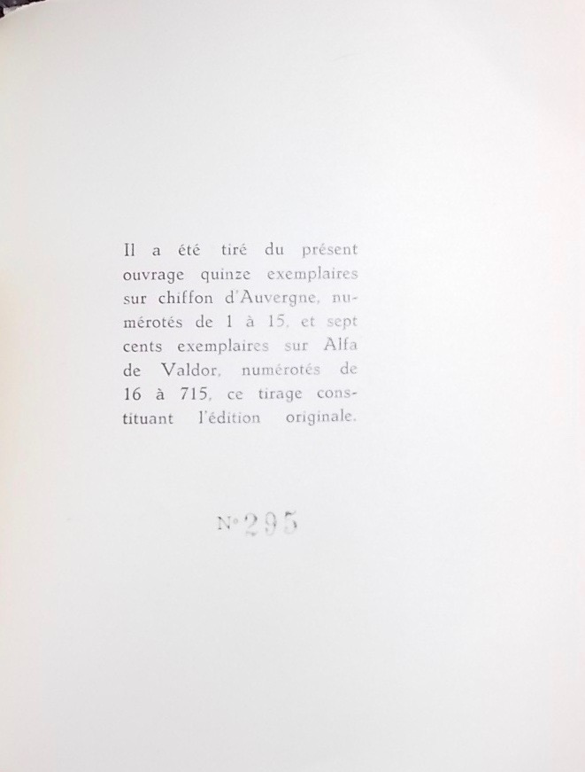Edition originale numérotée 1/700 exemplaires sur alfa de Valdor (seul tirage après 15 exemplaires de tête sur chiffon d’Auvergne). Nom de possesseur en page de faux-titre, sinon très bel exemplaire, ce qui n’est pas très courant vu la fragilité de la couverture.