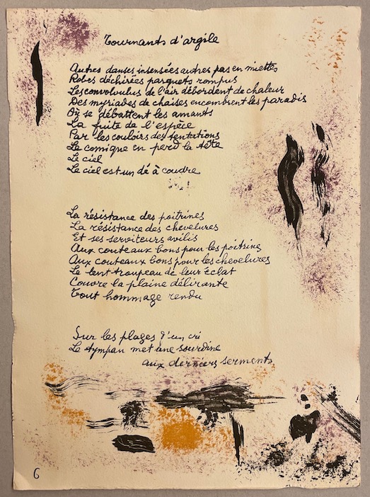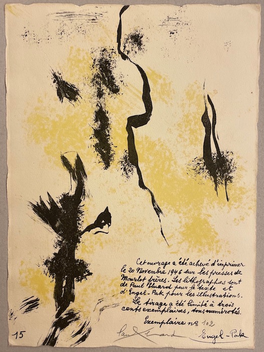 Edition originale. Un des 300 exemplaires numérotés sur vélin d’Arches. Choix de poèmes manuscrits illustrés par Engel-Pak, reproduits en lithographies et tirées sur les presses de Mourlot frères.