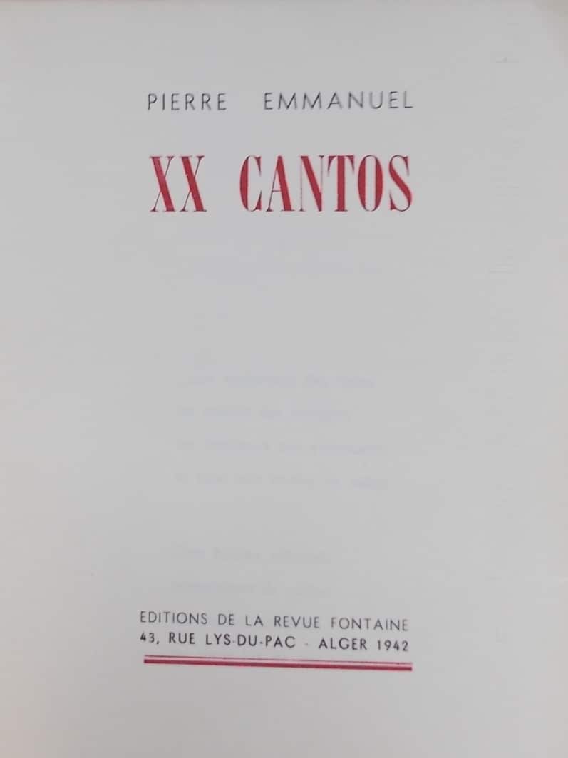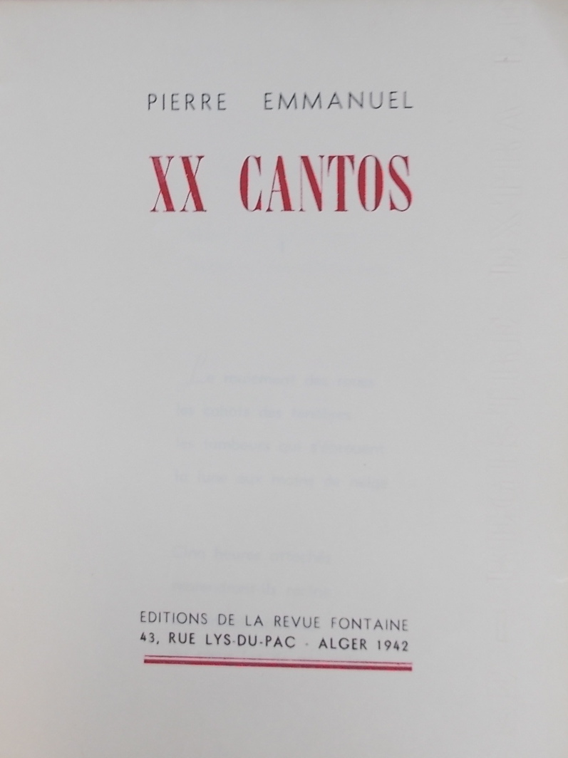 EMMANUEL (Pierre) XX Cantos. Alger, Editions de la Revue Fontaine, 1942.