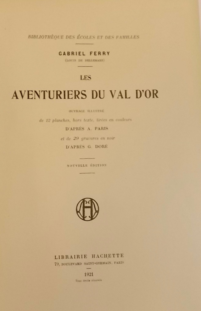 FERRY (Gabriel) Les aventurier du Val d’Or. Paris, Librairie Hachette (coll. Bibliothèque des Ecoles et des Familles), 1921.