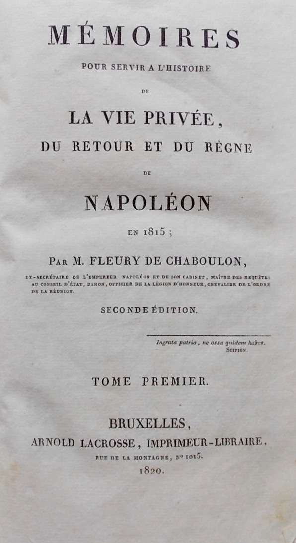 FLEURY DE CHABOULON (Pierre-Alexandre-Edouard) Mémoires pour servir à l’histoire de la vie privée, du retour et du règne de Napoléon en 1815. Bruxelles, Arnold Lacrosse, 1820.