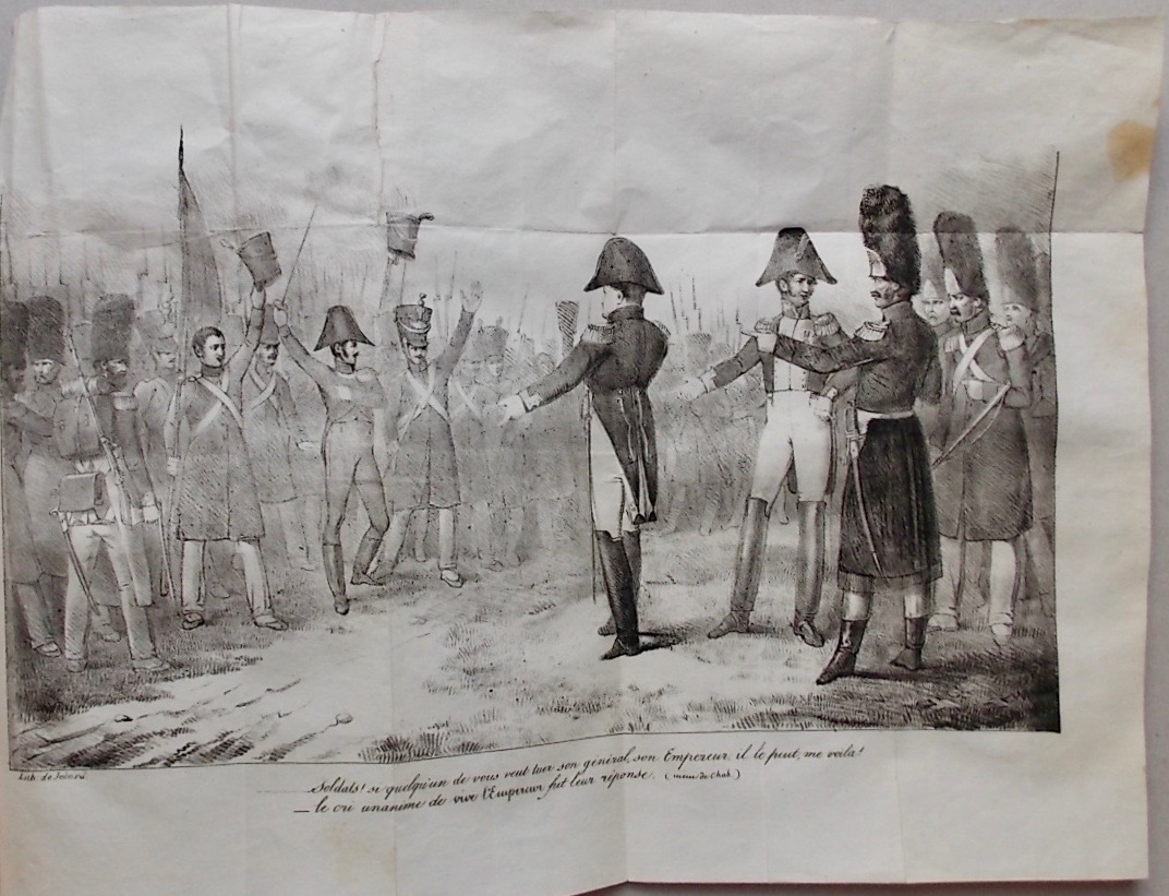 Seconde édition parue la même année que la première imprimée à Londres. Avec en frontispice du premier volume, un portrait en pied de Napoléon et une grande planche lithographiée dépliante. Source importante pour le retour de l’île d’Elbe et les Cent-Jours. Tulard, 551.