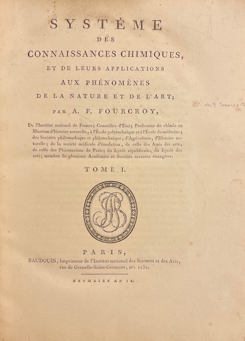 ![FOURCROY (Antoine François) Système des connaissances chimiques et de leurs applications aux phénomènes de la nature et de l'art. Paris, Baudouin, an IX [1800]. – Image 2](https://cabinetamateur.ch/wp-content/uploads/2025/11/41152_2.jpg)