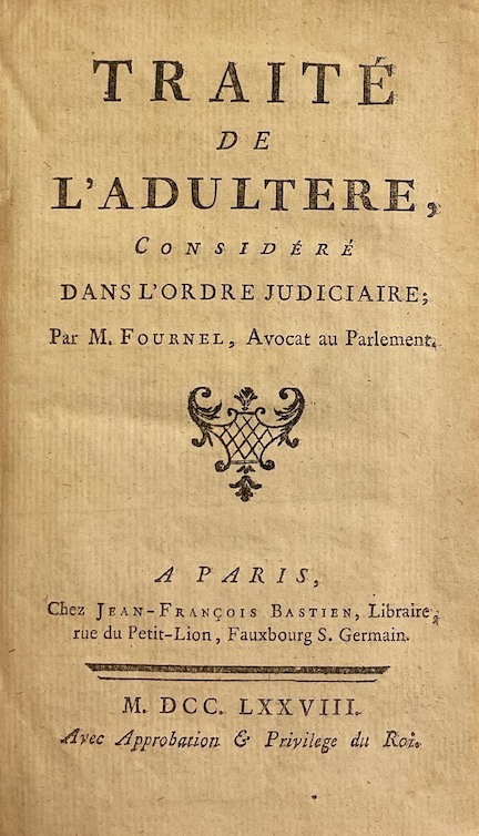 FOURNEL (Jean-François) Traité de l’adultère, considéré dans l’ordre judiciaire. A Paris, chez Jean-François Bastien, 1778.
