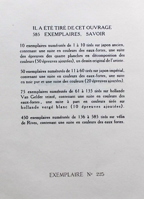 Un des 400 exemplaires sur vélin de Rives [tirage total 535 exemplaires]. Illustré de 20 eaux-fortes originales en couleurs de Pierre Brissaud présentées sous serpentes imprimées. Galeries de vers en marge des deux volumes, sinon très beaux exemplaires.